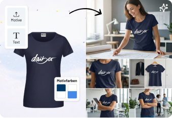 Unsere KI-Inspiration setzt Ihr Produkt mit Ihrem Logo im Handumdrehen in realistische Szenen. So sehen Sie sofort, wie Ihr Design im Einsatz wirkt – ideal für Inspiration, überzeugende Präsentationen oder professionelle Produktdarstellungen.